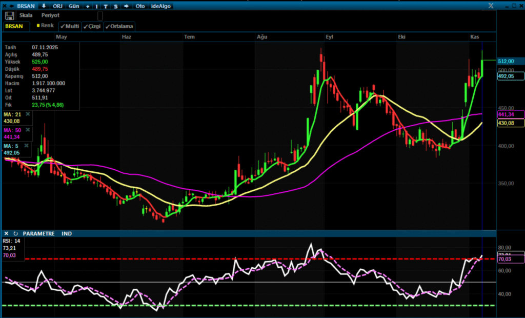 BRSAN hissesi, bilanço öncesinde başlayan güçlü yükseliş trendiyle Kasım başında 512 TL kapanış fiyatına ulaştı. Kısa vadeli ortalama (MA5 – 492 TL) ve orta vadeli ortalama (MA21 – 430 TL) uzun vadeli ortalamanın (MA50 – 441 TL) üzerine çıkarak “altın kesişim” (golden cross) sinyali verdi. Bu teknik görünüm, orta vadede pozitif eğilimin devam edebileceğine işaret ediyor.