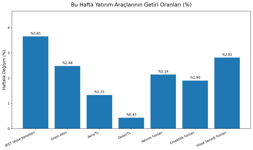Bu hafta yatırım araçları yatırımcısına kazandırdı. En yüksek getiriyi yüzde 3,65 ile Borsa İstanbul sağlarken, altın, avro, dolar ve fonlar da haftayı yükselişle kapattı. BIST 100 endeksi ise tarihi rekor seviyelere ulaştı.
