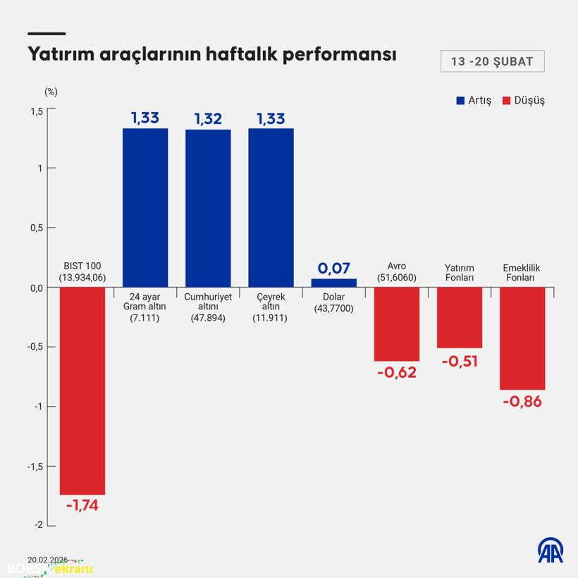 Borsa İstanbul’da işlem gören hisse senetleri haftalık bazda ortalama yüzde 1,74, avro/TL yüzde 0,62 değer kaybederken, altının gram fiyatı yüzde 1,33, dolar/TL yüzde 0,07 değer kazandı. BIST 100 endeksi, en düşük 13.718,14 puanı ve en yüksek 14.532,67 puanı gördükten sonra haftayı, önceki hafta kapanışının yüzde 1,74 altında 13.934,06 puandan tamamladı. Kapalıçarşı’da işlem gören 24 ayar külçe altının gram satış fiyatı bu hafta yüzde 1,33 artışla 7 bin 111 liraya, cumhuriyet altınının satış fiyatı da yüzde 1,32 yükselişle 47 bin 894 liraya çıktı. Geçen hafta sonu 11 bin 755 lira olan çeyrek altının satış fiyatı yüzde 1,33 artarak 11 bin 911 liraya yükseldi. Bu hafta ABD doları yüzde 0,07 artarak 43,7700 lira, avro ise yüzde 0,62 düşerek 51,6060 lira oldu. Yatırım fonları bu hafta yüzde 0,51, emeklilik fonları yüzde 0,86 değer kaybetti. Kategorilerine göre bakıldığında, yatırım fonları arasında en çok kazandıranlar yüzde 0,71 ile “Para Piyasası” fonları oldu.