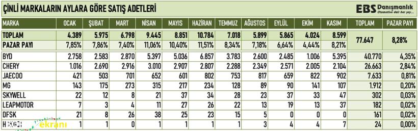 Gazeteci Emre Özpeynirci, Çinli otomobil markalarının Türkiye performansını açıkladı. Verilere göre Çinli markalar, yılın ilk 11 ayında toplam 77 bin 647 adet satış gerçekleştirerek yüzde 8,28 pazar payına ulaştı.
