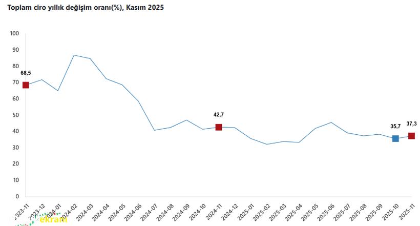 Türkiye İstatistik Kurumu (TÜİK) tarafından açıklanan Ciro Endekslerinin, Kasım 2025 verileri de paylaşıldı. Sanayi, inşaat, ticaret ve hizmet sektörleri toplamında ciro endeksi, Kasım ayında geçen yılın aynı dönemine göre yüzde 37,3 oranında artış kaydetti.