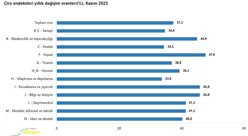 Yıllık bazda bakıldığında, en yüksek artış inşaat sektöründe gerçekleşti. İnşaat ciro endeksi yüzde 47,6 yükselirken, hizmet sektörü yüzde 39,3, ticaret sektörü yüzde 36,8 ve sanayi sektörü yüzde 34,6 oranında artış gösterdi.