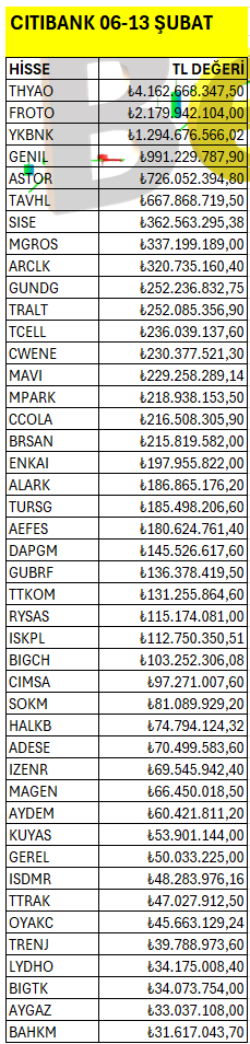 Citibank’ın haftalık bazda Borsa İstanbul’da en fazla yatırım yaptığı hisselerin listesi. Listeyi PDF formatında indirip inceleyebilirsiniz.