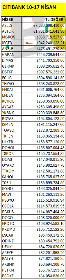 Citibank’ın haftalık bazda Borsa İstanbul’da en fazla yatırım yaptığı hisselerin listesi. Listeyi PDF formatında indirip inceleyebilirsiniz.