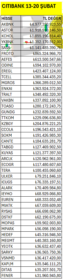 Citibank’ın haftalık bazda Borsa İstanbul’da en fazla yatırım yaptığı hisselerin listesi. Listeyi PDF formatında indirip inceleyebilirsiniz.