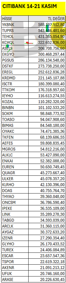 Citibank’ın haftalık bazda Borsa İstanbul’da en fazla yatırım yaptığı hisselerin listesi. Listeyi PDF formatında indirip inceleyebilirsiniz.