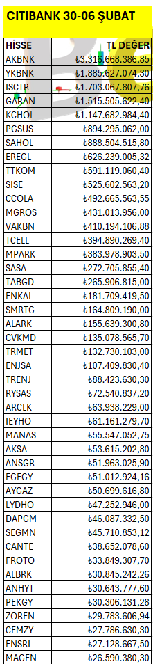 Citibank’ın haftalık bazda Borsa İstanbul’da en fazla yatırım yaptığı hisselerin listesi. Listeyi PDF formatında indirip inceleyebilirsiniz.
