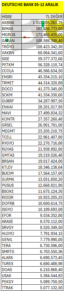 Deutsche Bank’ın haftalık bazda Borsa İstanbul’da en fazla yatırım yaptığı hisselerin listesi. Listeyi PDF formatında indirip inceleyebilirsiniz.