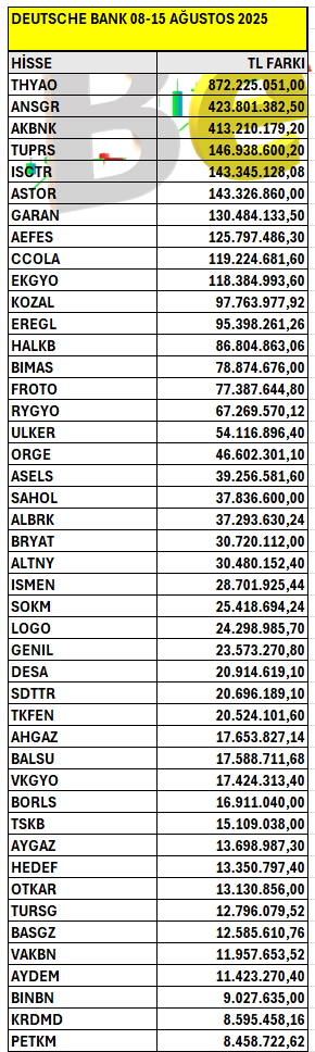 Deutsche Bank’ın haftalık bazda Borsa İstanbul’da en fazla yatırım yaptığı hisselerin listesi. Listeyi PDF formatında indirip inceleyebilirsiniz.
