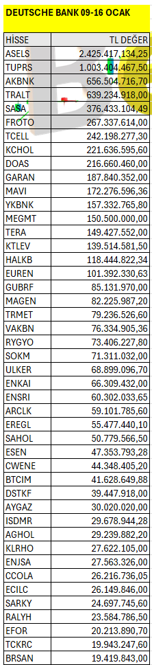 Deutsche Bank’ın haftalık bazda Borsa İstanbul’da en fazla yatırım yaptığı hisselerin listesi. Listeyi PDF formatında indirip inceleyebilirsiniz.