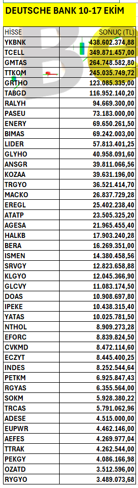 Deutsche Bank’ın haftalık bazda Borsa İstanbul’da en fazla yatırım yaptığı hisselerin listesi. Listeyi PDF formatında indirip inceleyebilirsiniz.