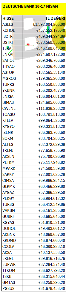 Deutsche Bank’ın haftalık bazda Borsa İstanbul’da en fazla yatırım yaptığı hisselerin listesi. Listeyi PDF formatında indirip inceleyebilirsiniz.