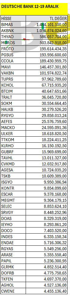 Deutsche Bank’ın haftalık bazda Borsa İstanbul’da en fazla yatırım yaptığı hisselerin listesi. Listeyi PDF formatında indirip inceleyebilirsiniz.