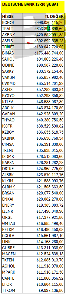 Deutsche Bank’ın haftalık bazda Borsa İstanbul’da en fazla yatırım yaptığı hisselerin listesi. Listeyi PDF formatında indirip inceleyebilirsiniz.