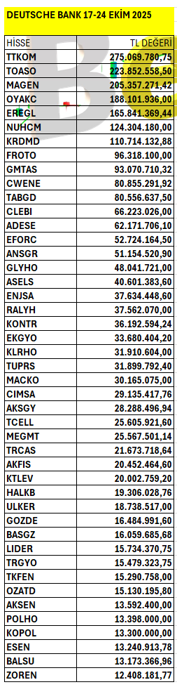 Deutsche Bank’ın haftalık bazda Borsa İstanbul’da en fazla yatırım yaptığı hisselerin listesi. Listeyi PDF formatında indirip inceleyebilirsiniz.