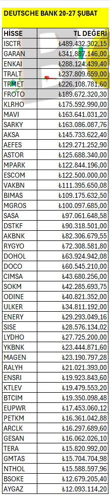 Deutsche Bank’ın haftalık bazda Borsa İstanbul’da en fazla yatırım yaptığı hisselerin listesi. Listeyi PDF formatında indirip inceleyebilirsiniz.