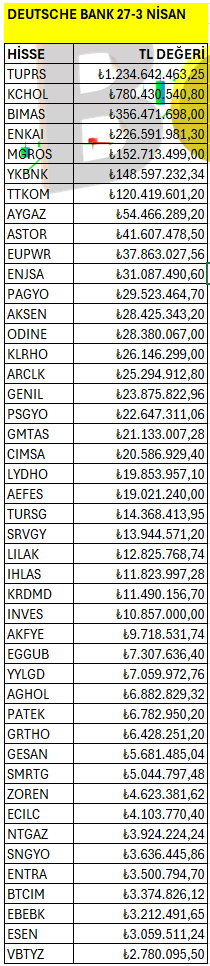 Deutsche Bank’ın haftalık bazda Borsa İstanbul’da en fazla yatırım yaptığı hisselerin listesi. Listeyi PDF formatında indirip inceleyebilirsiniz.