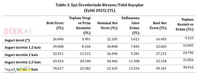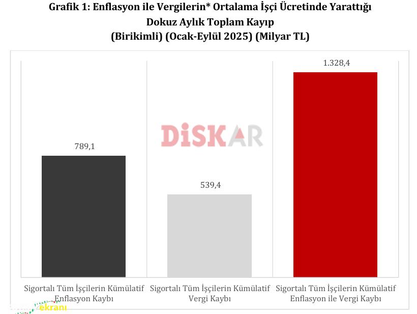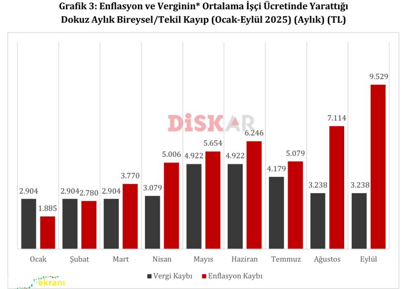 DİSK-AR’ın araştırmasına göre; ortalama işçi ücretinde Ocak 2025 tarihinde enflasyon nedeniyle yaşanan kayıp 1.885 TL iken Eylül 2025’te bu miktar 9 bin 529 TL’ye yükseldi. Gelir ile damga vergisi ve enflasyon nedeniyle ocak ayındaki erime 4 bin 789 TL iken bu miktar eylül ayında 12 bin 767 TL oldu. Ortalama işçi ücretinin dokuz aylık birikimli bireysel enflasyon erimesi ise 47 bin 64 TL oldu. Toplam kayıplara bakıldığında ise sadece sigortalı işçilerin aylık enflasyon kaybı Eylül 2025’te toplam (tüm işçiler için) 161,8 milyar TL’ye ulaşırken enflasyon ve vergi kaynaklı toplam erime 216,8 milyar TL olarak gerçekleşti.