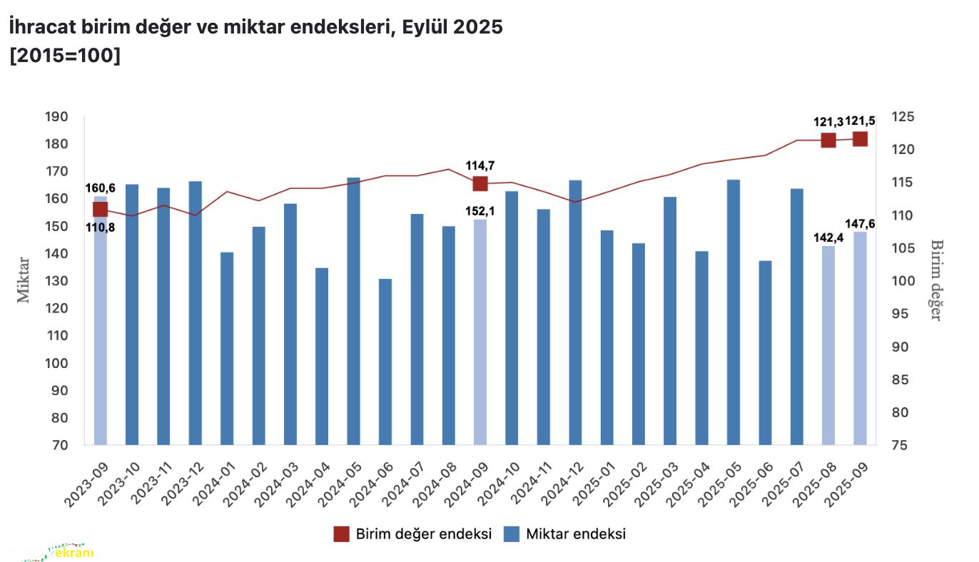 2025 Eylül ayında ihracat birim değer endeksi, bir önceki yılın aynı dönemine göre %6,0 artarak 114,7 puandan 121,5 puana yükseldi. Bu artışa en fazla katkıyı %11,1 ile gıda, içecek ve tütün ürünleri sağladı. Ham maddeler (yakıt hariç) grubunda %6,9, imalat sanayinde (gıda, içecek ve tütün hariç) %5,8 oranında artış görülürken; yakıt grubunda %7,1 oranında düşüş kaydedildi. Ancak aynı dönemde ihracat miktar endeksi %3,0 düşerek 152,1 puandan 147,6 puana geriledi. Gıda, içecek ve tütün sektöründe %11,9’luk bir azalma görülürken, imalat sanayinde %3,1’lik gerileme yaşandı. Yakıt grubundaki miktar endeksi ise %28,9 artarak dikkat çekici bir yükseliş gösterdi.