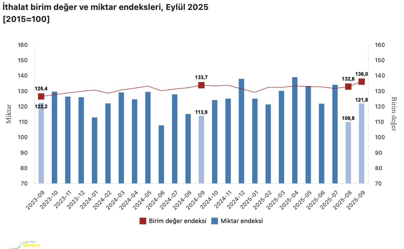 İthalat miktar endeksinde ise mevsim ve takvim etkilerinden arındırılmış veriler, Eylül ayında %5,8 artışla 113,9 puandan 120,5 puana yükseldi. Takvim etkilerinden arındırılmış ithalat miktarı yıllık bazda %3,7 artarak 113,7 puandan 117,9 puana çıktı.