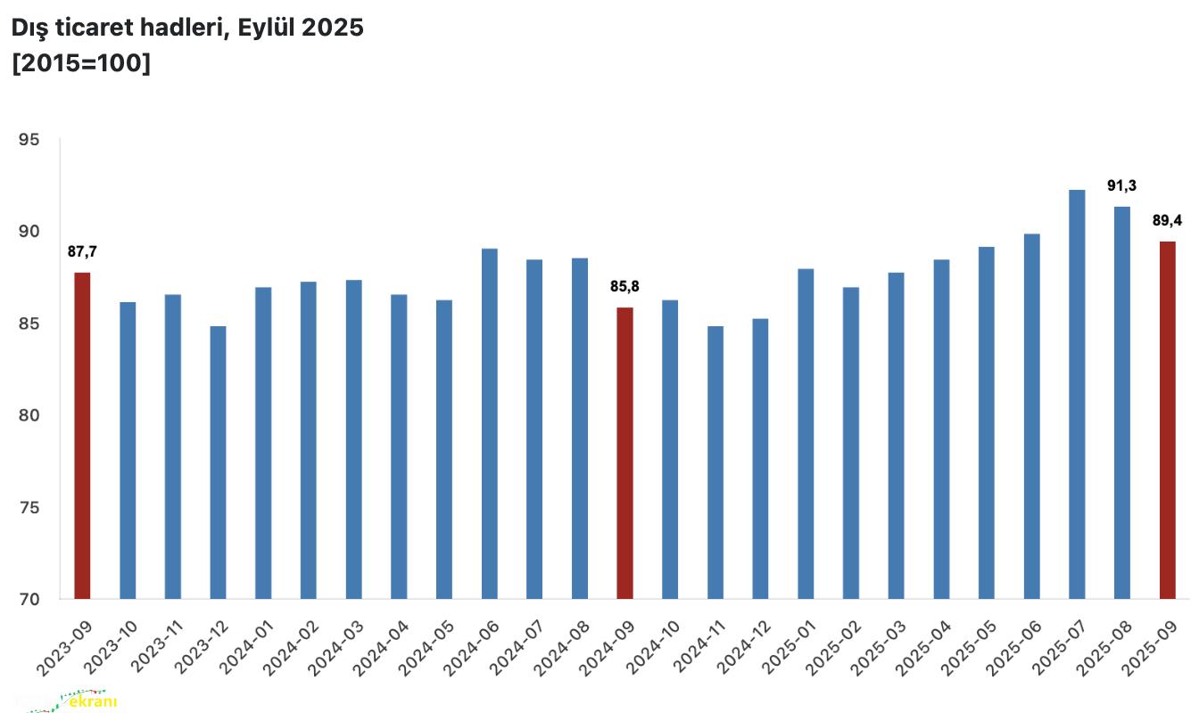 İhracat birim değer endeksinin ithalat birim değer endeksine bölünmesiyle hesaplanan dış ticaret haddi, 2024 yılı Eylül ayında 85,8 iken, 2025 yılı Eylül ayında 3,6 puanlık artışla 89,4 seviyesine çıktı. Bu durum, aynı dönem içinde ihracat birim değerlerinin ithalata göre daha fazla arttığını gösterdi. TÜİK, dış ticaret endekslerinin bir sonraki bülteninin 12 Aralık 2025 tarihinde yayımlanacağını bildirdi.