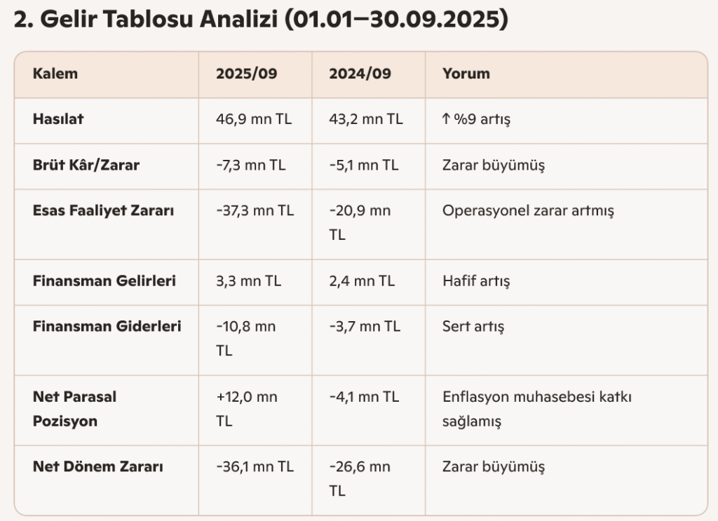 • Net Dönem Zararı: -36,1 mn TL (2024/09: -26,6 mn TL, zarar büyüdü)