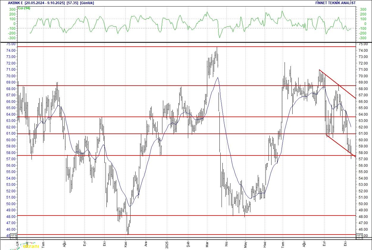 nbsp;20 günlük ortalamasının altında. Alım aralığı: 13.10-12.70 Satım aralığı: 14.40-15.60 Endeks Ağırlığı (%): 0.83 Haftalık Değişim: IMKB 100 Endeksindeki ağırlığı geçen haftaya göre 0.036 puan arttı. AKBANK DÜŞÜŞTE 63.1 seviyesinden başlayan düşüş seyrinde. 57.35 seviyesinin altındaki kapanışlarda güç kaybı devam edebilir.
