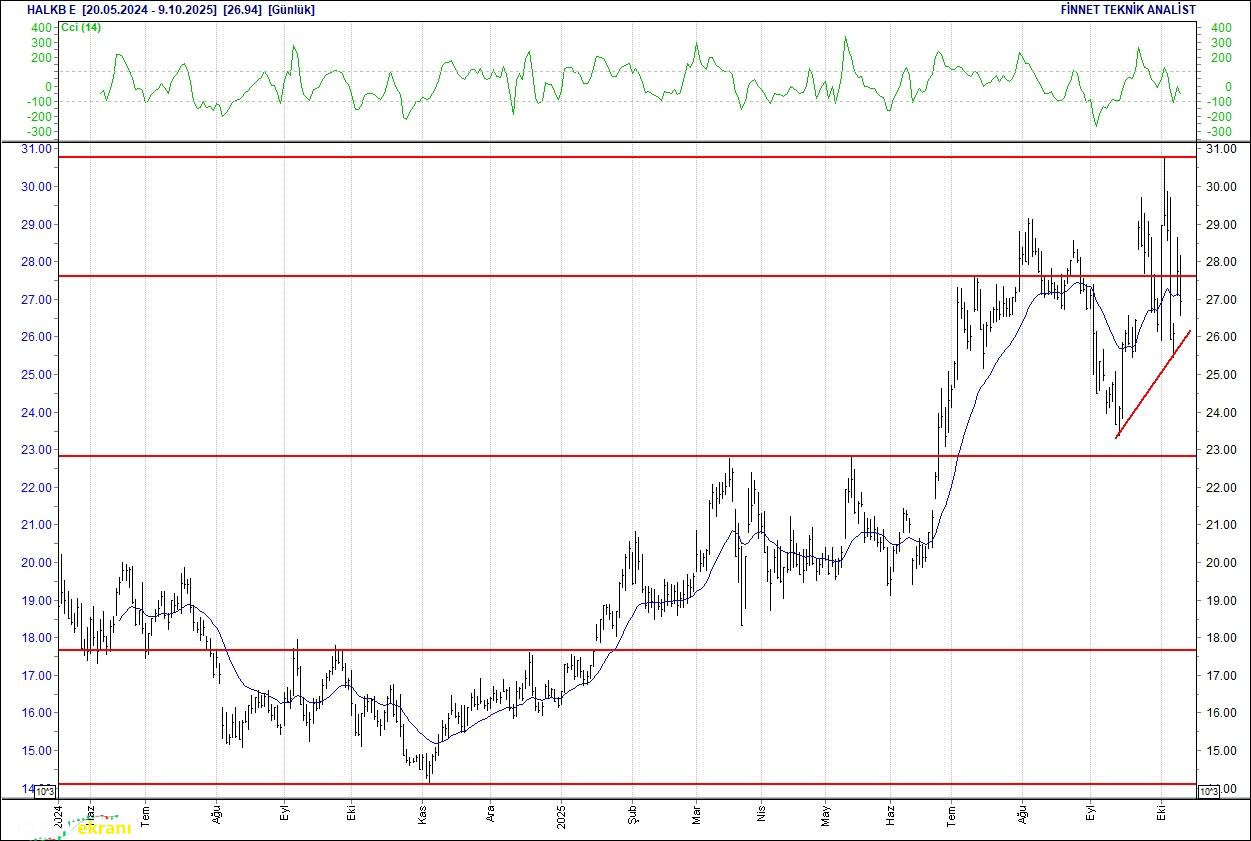 GARANTİ BANKASI TABAN OLUŞUMU İZLENMELİ Hissede 130 seviyesinin altındaki kapanışlar, 123.00 seviyesine doğru satışların devam etmesine neden olabilir. 130 seviyesinin üzerindeki kapanışlarda ise 141.00 seviyesindeki direncini test edebilir. 20 günlük ortalamasının altında. Alım aralığı: 123.00-119.00 Satım aralığı: 141.00-143.00 Endeks Ağırlığı (%): 2.41 Haftalık Değişim: IMKB 100 Endeksindeki ağırlığı geçen haftaya göre -0.102 puan azaldı. T. HALK BANKASI GÜÇ KAYBEDİYOR Para çıkışı yaşanıyor. Hissede 26.94 seviyesinin altındaki kapanışlarda 25.25 seviyesine doğru gerileme yaşanabilir. 26.94 seviyesinin üzerindeki kapanışlarda ise 28.88 seviyesi hedef olacaktır.