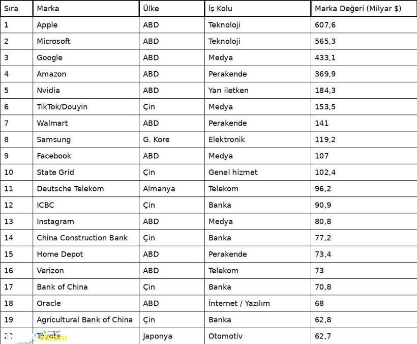 Apple, 607,6 milyar dolarla geçen yıl olduğu gibi dünyanın en değerli markası olarak belirlendi. Şirketin marka değerinin 2025’te 574,5 milyar dolar olduğu görülmüştü. Apple’ı sırasıyla yaklaşık 565,3 milyar dolarla Microsoft, 433,1 milyar dolarla Google takip etti. Microsoft’un marka değeri 2025’te yaklaşık 461,1 milyar dolar, Google’ın 413 milyar dolar seviyesindeydi. Söz konusu listede ABD şirketi Amazon yaklaşık 369,9 milyar dolarla 4’üncü, ABD şirketi Nvidia 184,3 milyar dolarla 5’inci, Çinli şirket Tiktok 153,5 milyar dolarla 6’ncı, ABD’li perakende şirketi Walmart 141 milyar dolarla 7’nci, Güney Koreli Samsung 119,2 milyar dolarla 8’inci, ABD’li Facebook 107 milyar dolarla 9’uncu, Çinli State Grid 102,4 milyar dolarla 10’uncu oldu.