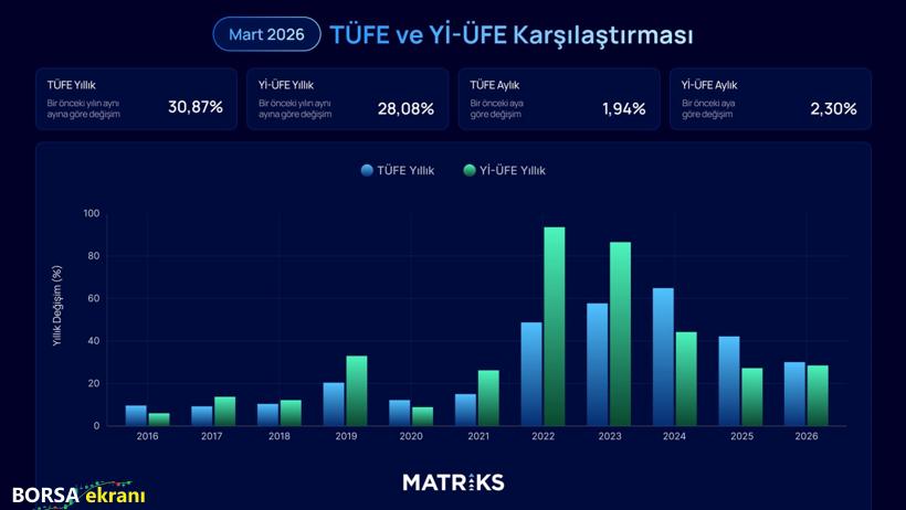 Birçok kurum enerji fiyatları ve jeopolitik gelişmelerin riskleri artırdığına dikkat çekti. Faiz tarafında ise beklentiler ağırlıklı olarak yıl sonu için yüzde 31-32 bandında şekillendi. Nisan ayı PPK toplantısında genel beklenti faizlerin sabit tutulması yönünde oluştu; bazı kurumlar ise risklerin devam etmesi halinde ilave sıkılaşma ihtimalinin gündemde kalabileceğini belirtti. Tüketici fiyat endeksi (TÜFE) aylık yüzde 1,94, yıllık bazda ise yüzde 30,87 artış kaydetti. Matriks Haber anketinde beklentiler, 2026 yılı Mart ayında TÜFE’nin aylık yüzde 2,35, yıllık bazda ise yüzde 31,45 artacağı yönünde gerçekleşmişti. Ankette yıl sonu enflasyon beklentisi yüzde 24,00’ten yüzde 25,80 seviyesine yükseltilmişti.