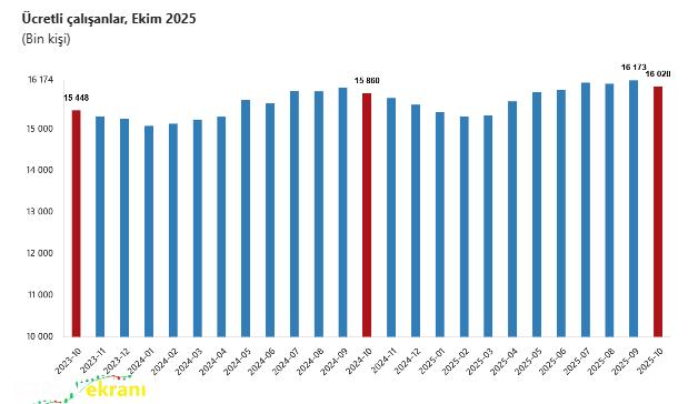 Türkiye İstatistik Kurumu (TÜİK) 2025 yılı ekim ayına ait ücretli çalışan istatistiklerini açıkladı. Buna göre, sanayi, inşaat ve ticaret-hizmet sektörleri toplamında ücretli çalışan sayısı 2025 Ekim ayında bir önceki yılın aynı ayına göre yüzde 1 arttı. Ücretli çalışan sayısı bir önceki yılın aynı ayında 15 milyon 860 bin 31 kişi iken, 2025 yılı Ekim ayında 16 milyon 20 bin 394 kişi oldu.