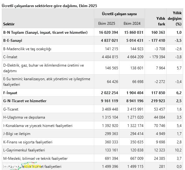 Ücretli çalışanların alt detaylarına bakıldığında; 2025 Ekim ayında ücretli çalışanlar aylık olarak sanayi sektöründe yüzde 0,3 azalırken, inşaat sektöründe yüzde 0,3 ve ticaret-hizmet sektöründe yüzde 0,1 arttı.