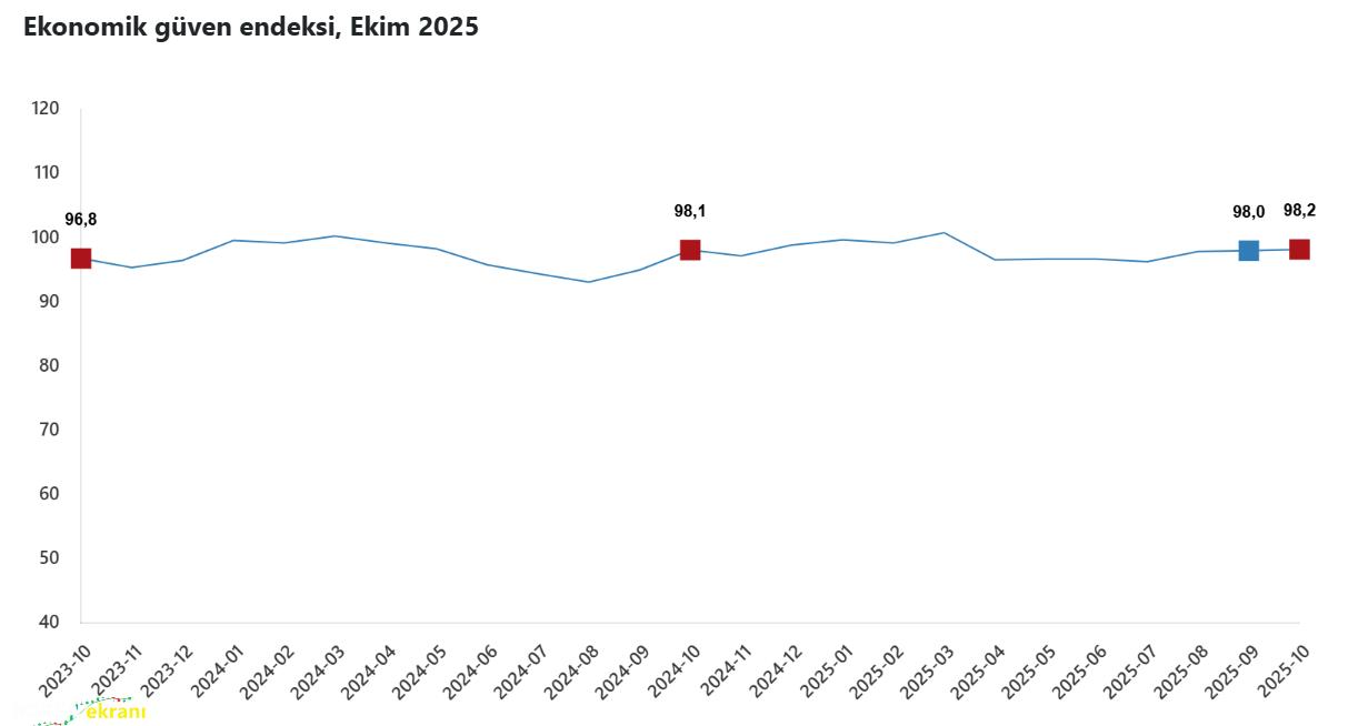 Türkiye İstatistik Kurumu (TÜİK), ekim ayı ekonomik güven endeksi verilerini açıkladı. Buna göre, Bir önceki aya göre ekim ayında tüketici güven endeksi yüzde 0,3 oranında azalarak 83,6 değerini, reel kesim (imalat sanayi) güven endeksi yüzde 1,2 oranında artarak 102,0 değerini aldı. Hizmet sektörü güven endeksi ise yüzde 0,3 oranında azalarak 110,7 değerini, perakende ticaret sektörü güven endeksi yüzde 3,7 oranında artarak 113,2 değerini, inşaat sektörü güven endeksi yüzde 5,3 oranında azalarak 83,7 değerini aldı.