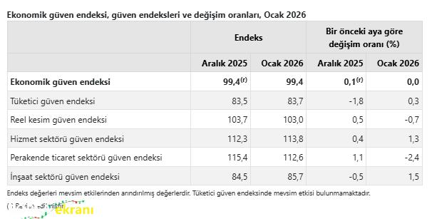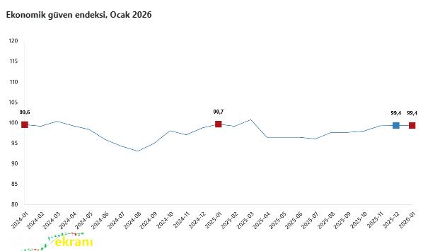 Türkiye İstatistik Kurumu (TÜİK), 2026 yılı Ocak ayına ait ekonomik güven endeksi verilerini açıkladı. Buna göre, ekonomik güven endeksi Ocak ayında aynı düzeyde kalarak 99,4 değerini aldı. Bir önceki aya göre Ocak ayında tüketici güven endeksi yüzde 0,3 oranında artarak 83,7 değerini, reel kesim (imalat sanayi) güven endeksi yüzde 0,7 oranında azalarak 103,0 değerini aldı.