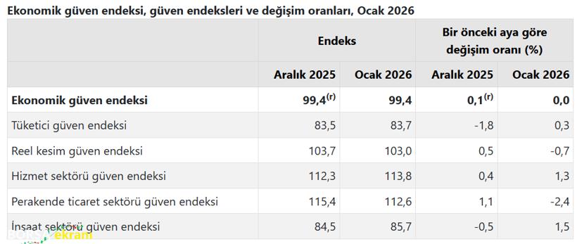 TÜİK verilerine göre ekonomik güven endeksi ocak ayında aynı düzeyde kalarak 99,4 değerini aldı. Bir önceki aya göre ocak ayında tüketici güven endeksi yüzde 0,3 oranında artarak 83,7 değerini, reel kesim (imalat sanayi) güven endeksi yüzde 0,7 oranında azalarak 103,0 değerini, hizmet sektörü güven endeksi yüzde 1,3 oranında artarak 113,8 değerini, perakende ticaret sektörü güven endeksi yüzde 2,4 oranında azalarak 112,6 değerini, inşaat sektörü güven endeksi yüzde 1,5 oranında artarak 85,7 değerini aldı. Ekonomik güven aralık ayında bir önceki ayla aynı düzeyde kalarak 99,5 değerini almış, ekonomik güven bir kasım ayında 99,5 değeriyle son 9 ayın zirvesini görmüştü.
