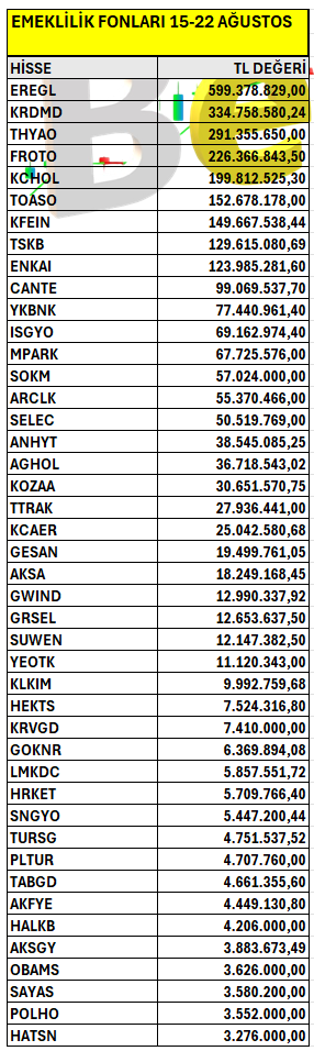 Emeklilik Fonları’nın haftalık bazda Borsa İstanbul’da en fazla yatırım yaptığı hisselerin listesi. Listeyi PDF formatında indirip inceleyebilirsiniz
