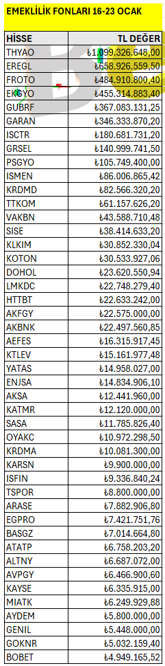 Emeklilik Fonları’nın haftalık bazda Borsa İstanbul’da en fazla yatırım yaptığı hisselerin listesi. Listeyi PDF formatında indirip inceleyebilirsiniz.