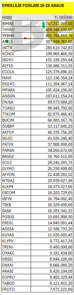 Emeklilik Fonları’nın haftalık bazda Borsa İstanbul’da en fazla yatırım yaptığı hisselerin listesi. Listeyi PDF formatında indirip inceleyebilirsiniz.