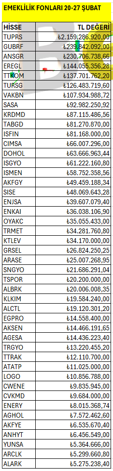 Emeklilik Fonları’nın haftalık bazda Borsa İstanbul’da en fazla yatırım yaptığı hisselerin listesi. Listeyi PDF formatında indirip inceleyebilirsiniz.