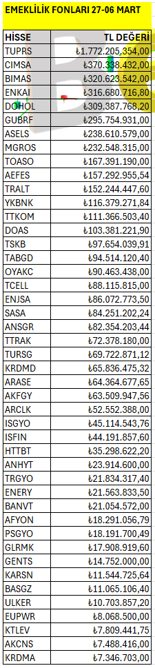 Emeklilik Fonları’nın haftalık bazda Borsa İstanbul’da en fazla yatırım yaptığı hisselerin listesi. Listeyi PDF formatında indirip inceleyebilirsiniz.