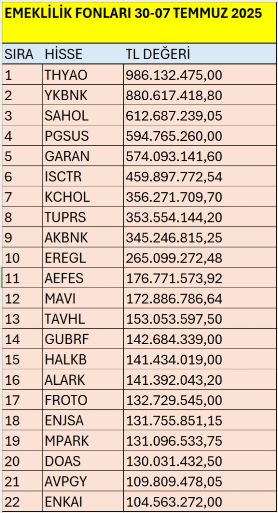 Bu tablo emeklilik fonlarının haftalık bazda aldığı hisselerin o günkü işlem fiyatı ile çarpılması sonucu oluşturulmuştur.