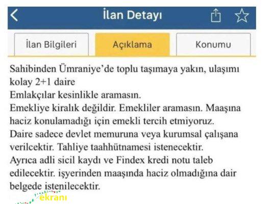 Bakanlığın yazılı açıklamasında, internet sitesindeki ayrımcı ifadeye yönelik işlem yapıldığı duyuruldu. İnternette yayım yapan bir ilan sitesinde “emekliye kiralık değildir” ibaresiyle yayımlanan konut ilanına dikkati çekilen açıklamada, “Bakanlığımızca yapılan inceleme sonucunda Taşınmaz Ticareti Hakkında Yönetmeliğe aykırılık tespit edilerek ilan yayından kaldırılmış, ilgili emlak işletmesi hakkında idari para cezası uygulanmıştır.” denildi.