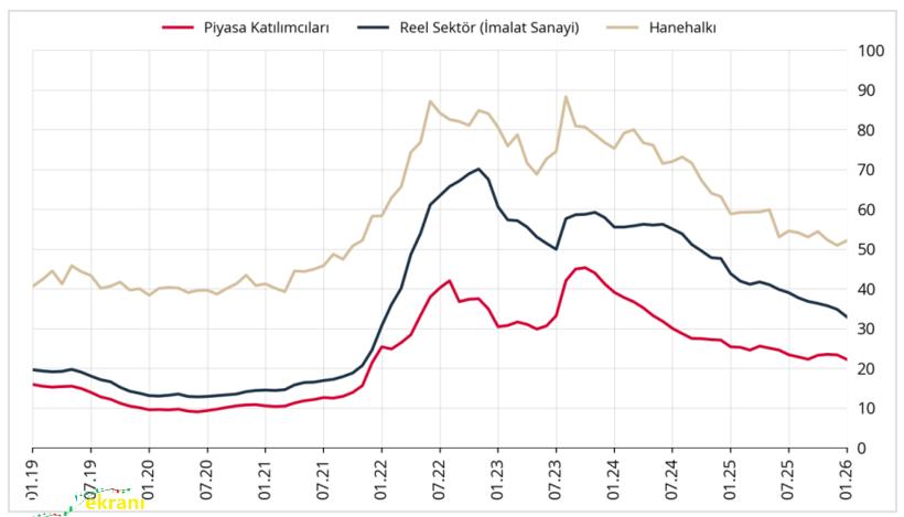 Verilere göre, 12 ay sonrası yıllık enflasyon beklentisi piyasa katılımcıları için 1,15 puanlık düşüşle yüzde 22,20’ye, reel sektör için 1,90 puanlık düşüşle yüzde 32,90’a geriledi. Buna karşılık hane halkının enflasyon beklentisi 1,18 puan artarak yüzde 52,08 seviyesine yükseldi. TCMB verileri, beklentilerdeki ayrışmayı da gösterdi.