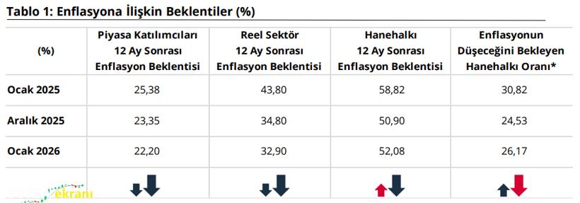 Türkiye Cumhuriyet Merkez Bankası (TCMB), 2026 yılı Ocak ayına ilişkin Sektörel Enflasyon Beklentileri verilerini yayımladı. Piyasa Katılımcıları Anketi, İktisadi Yönelim Anketi ve TÜİK iş birliğiyle yürütülen Tüketici Eğilim Anketi sonuçlarına göre, 12 ay sonrası yıllık enflasyon beklentileri piyasa ve reel sektörde gerilerken, hanehalkında yükseldi.