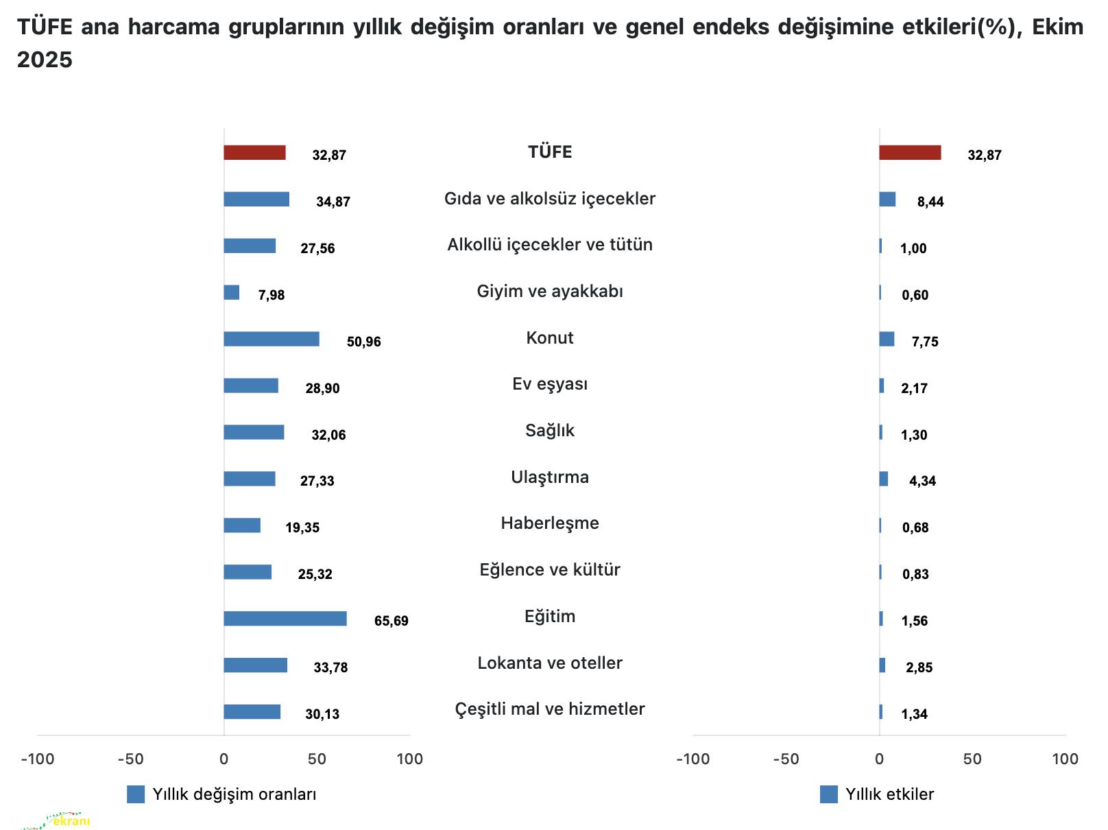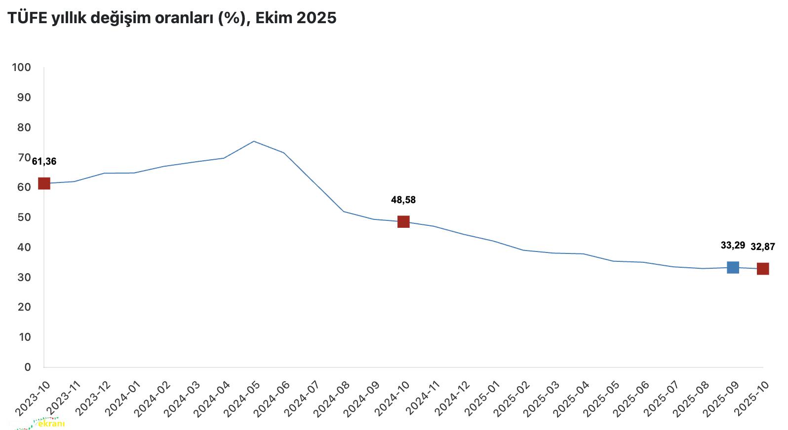 TÜFE’de Ekim ayında bir önceki aya göre yüzde 2,55 artış kaydedildi. Bir önceki yılın Aralık ayına göre artış oranı yüzde 28,63 olurken, bir önceki yılın aynı ayına göre yüzde 32,87’ye ulaştı. On iki aylık ortalamalara göre artış oranı ise yüzde 37,15 olarak gerçekleşti.