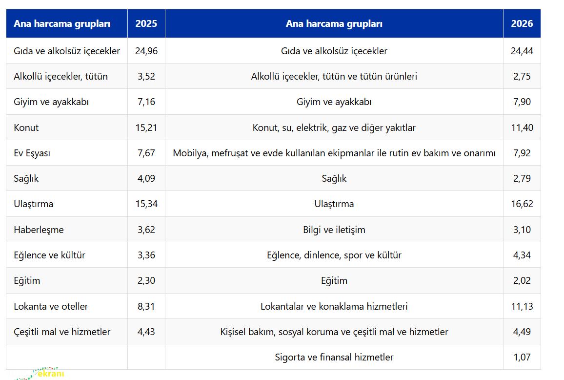 Baz yıl güncellendi Yürütülen çalışmalar neticesinde “2025” TÜFE için yeni baz yılı (temel yıl) olarak belirlendi. Baz yılı, fiyat endekslerinin “100” olarak kabul edildiği yıl olarak tanımlanıyor. Baz yılının yenilenmesi, endeksin yorumlanmasını kolaylaştırırken, uluslararası karşılaştırılabilirliği artırmakta ve endeks seviyelerinin aşırı büyümesini engelleyerek, daha anlaşılır referans noktası sağlıyor. Baz yılının değişmesiyle, TÜFE’de halen kullanılan mevcut sınıflama yapısı yerine, güncel tüketim kalıplarını daha iyi yansıtan “Amaca Göre Bireysel Tüketim Sınıflaması COICOP-2018″e geçilmesine karar verildi. Yeni baz yılı, sınıflama ve ağırlık yapısı ile üretilen ilk veriler, ocak TÜFE haber bülteniyle yayımlandı. Bu işlem, endeksin yeniden hesaplanmasını değil, yalnızca mevcut verilerin yeni sınıflama yapısına uygun şekilde gruplanmasını ifade ediyor. Bu nedenle, manşet enflasyon göstergelerinde herhangi bir değişiklik olmayacak. Yalnızca bazı alt endekslerde sınıflama farkından kaynaklı değişiklikler görülebilecek. Sepette yer alan ürünlerin sayısı değişiyor Açıklamaya göre, bu yıl itibarıyla alandan veri derleme yöntemiyle elde edilecek fiyat sayısı, derlenen toplam fiyat sayısının yaklaşık yüzde 51,14’ünü oluşturacak. TÜFE’de bu yıl 81 il ve 239 ilçe kapsamında, 39 bin 70 iş yeri ve 5 bin 246 konuttan (kira) 428 madde ve 972 madde çeşidi için her ay yaklaşık 636 bin 640 fiyat derlenecek. Her yıl Aralık ayında yapılan güncellemede, hanehalklarının tüketim harcamalarında ağırlığı artan mal ve hizmetler endeks sepetine dahil ediliyor, ağırlığı azalan ürünler sepetten çıkarılıyor. Bu nedenle, TÜFE sepetinde yer alan ürünlerin sayısı her yıl değişim gösteriyor. TÜFE tüketim sepeti ve ağırlıkları ise yıl içinde değişmeden sabit kalıyor. Bu yıl TÜFE ağırlıklarının belirlenmesinde kullanılan temel veri kaynağının değişmesi ve yeni sınıflamaya geçilmiş olması nedeniyle madde sepetine yeni giren ve çıkan madde sayısının, geçen yıllara kıyasla fazla olduğu görüldü. Güncellemeye göre, bu yıl sepete simit (fırın, market ve benzeri yerlerde satılan), yöresel peynirler, hazır pizzalar, hazır börekler, okul forması, bebek elbisesi, termos ve otomobil ekspertiz ücreti gibi 38 madde listeye alındı. Kakao, ekmek hamuru (yufka), kravat, gazeteler ve tıraş malzemeleri gibi 30 ürün ise sepetten çıkarıldı. Ayrıca, hanehalklarının madde çeşidi düzeyinde değişim gösteren güncel tüketim tercihlerinin de TÜFE sepetine yansıtılabilmesi için her yıl olduğu gibi pek çok madde altına yeni madde çeşitleri eklendi. Örneğin, 2026 yılında dizel otomobil (madde) tamamen TÜFE sepetinden çıkarken, “otomobil (benzinli, elektrikli ve hibrid)” maddeleri altına yeni madde çeşitleri eklendi. Ana grup ağırlıkları TÜFE hesaplamalarında kullanılacak, ana grup ağırlıkları da belirlendi. TÜİK’in, enflasyon hesaplama güncellemesiyle “2003=100” olan baz yılını “2025=100” olarak değiştirmesiyle, ana grup sayısı da 12’den 13’e çıktı. Bazı ana grupların isimlerinde de değişikliğe gidildi. Özellikle dijital ürünler ve dijital içerik tüketimine ilişkin kategoriler, COICOP-2018’de ayrı bir sınıf haline getirildi ve belirsiz tanımlar ortadan kaldırıldı. Sigorta ve finansal hizmetler, yeni harcama grubu olarak enflasyon hesaplamasında yer aldı. Buna göre, gıda ve alkolsüz içeceklerin ağırlığı yüzde 24,96’dan yüzde 24,44’e, konut, su, elektrik, gaz ve diğer yakıtların ağırlığı yüzde 15,21’den yüzde 11,40’a gerilerken, ulaştırmanın ağırlığı 15,34’ten 16,62’ye yükseldi. Gıda ve alkolsüz içecekler, alkollü içecekler, tütün ve tütün ürünleri, konut, su, elektrik, gaz ve diğer yakıtlar, sağlık, eğitim, bilgi ve iletişim ana gruplarının ağırlığının azaldığı, giyim ve ayakkabı, mobilya, mefruşat ve evde kullanılan ekipmanlar ile rutin ev bakım ve onarımı, ulaştırma, eğlence, dinlence, spor ve kültür, lokantalar ve konaklama hizmetleri, kişisel bakım, sosyal koruma, çeşitli mal ve hizmetler gruplarının ağırlığının arttığı görüldü. Söz konusu ağırlıklar, alkollü içecekler, tütün ve tütün ürünlerinde yüzde 2,75, sağlıkta yüzde 2,79, bilgi ve iletişimde yüzde 3,10, eğitimde yüzde 2,02, giyim ve ayakkabıda yüzde 7,90, mobilya, mefruşat ve evde kullanılan ekipmanlar ile rutin ev bakım ve onarımında yüzde 7,92, eğlence, dinlence, spor ve kültürde yüzde 4,34, lokantalar ve konaklama hizmetlerinde yüzde 11,13, kişisel bakım, sosyal koruma, çeşitli mal ve hizmetlerinde yüzde 4,49 ve sigorta ve finansal hizmetlerde yüzde 1,07 olarak belirlendi. Tüketici fiyat endeksi ana gruplarının isim değişiklikleri ve oran ağırlıkları şöyle: