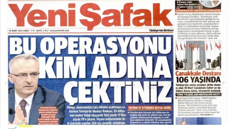 Yeni Şafak faiz politikaları konusunda oldukça müdahaleci ve etkili manşetleriyle biliniyor. Gazete daima faizlerin düşürülmesi yönünde tavır koyuyor. Daha önce 19 Mart 2021 tarihli sayısında dönemin TCMB Başkanı Naci Ağbal’ı hedef alarak TCMB’nin politika faizini artırmasını “Bu Operasyonu Kime Çektiniz? manşetiyle duyurmuş, bu manşetten 2 gün sonra Naci Ağbal görevinden alınmıştı. Naci Ağbal’ın yerine Yeni Şafak yazarı Şahap Kavcıoğlu getirilmiş ve yeni TCMB başkanı ilk iş olarak faiz indirme dönemini başlatmıştı. Bu yeni politika ile beraber enflasyonda hızlı bir artış gizlemişti.