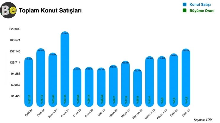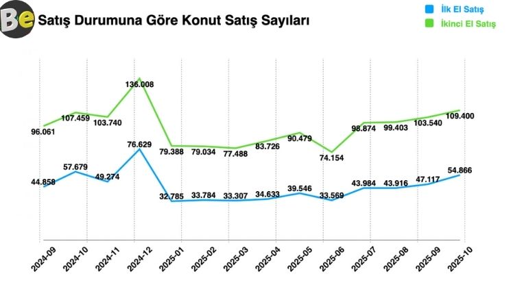 Ekim ayında konut satışları 164 bin 306 adet oldu. Bu rakam, yıllık bazda %0,5 düşüşe rağmen eylüle göre %9 artışa işaret etti. Böylece ocak–ekim döneminde konut satışları %16,2 yükselerek 1 milyon 293 bin adedi aştı. En çok satış yapılan iller İstanbul (26.305), Ankara (14.861) ve İzmir (8.678) olarak sıralandı.