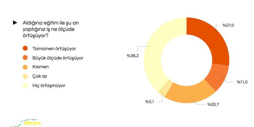 Araştırmada dikkat çeken bir diğer bulgu ise eğitim ile yapılan iş arasındaki uyumsuzluk oldu. Katılımcıların yüzde 38,2’si aldığı eğitimle yaptığı işin hiç örtüşmediğini belirtti. Saha çalışanlarında bu oran yüzde 56,9’a kadar çıkarken, ofis çalışanlarında yüzde 26,9 olarak kaydedildi. Bu durum, gençlerin kariyer yolculuğunda yön değiştirmek zorunda kaldığını gösteriyor.