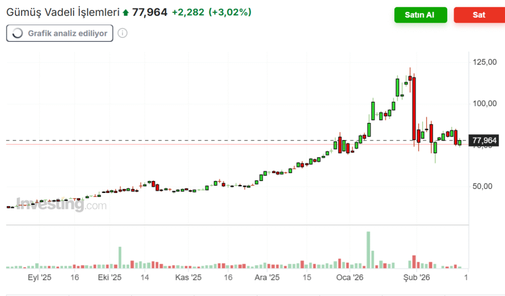 Gümüş vadeli işlemleri günlük grafikte 77,96 dolar seviyesinde işlem görürken, parabolik yükselişin sona ermesiyle birlikte yüksek volatilite ve belirgin aşağı yönlü momentum öne çıkıyor. Teknik görünümde 63,90 dolar seviyesi, kısa vadeli trendin kaderini belirleyecek kritik eşik olarak izleniyor.
